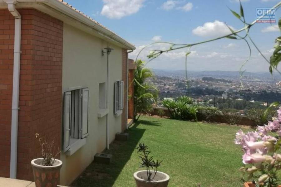 Vendue entièrement meublée, Cette grande et belle villa de plain pied, nichée sur les hauteurs d'Ambatobe, dans un lotissement résidentiel de renom sécurisé H24/7, est une valeur sûre pour votre projet de vie ou de placement, avec une forte valeur locative. Bâtie sur un terrain de 1.373 m2, son grand jardin verdoyant et bien entretenu d'environ 800 m2 offre un bel espace de vie extérieur, sans vis-à-vis direct et avec une vue exceptionnelle sur la ville, du Rova de Manjakamiadana jusqu'à l'aéroport d'Ivato. La surface habitable de 210 m2 quant à elle se compose d'une pièce à vivre extérieur de 23 m2, d'un séjour lumineux de 61 m2, s'ouvrant sur une terrasse de 48 m2, d'une grande cuisine ouverte équipée, de 2 chambres avec de beaux volumes intérieurs et des placards et d'une grande chambre parentale de 19 m2 avec une salle d'eau attenante. En prévision de tous problèmes de remontée d'humidité, la maison a été construite sur un vide sanitaire d'environ 40 cm et par souci d'une bonne isolation phonique, les parois vitrées sont en double vitrage. Et pour un meilleur confort au quotidien, un réservoir d'eau de 800L est également disponible. Proposée au prix de : 2.362.500.000 AR, Cette belle propriété se visite gratuitement en prenant rendez-vous au : +261 34 02 218 69 Mme Francia ou par mail e-mail à l'adresse : [coordonnées réservées] Honoraires à la charge du vendeur 28A62615, Numéro de mandat: 210T3 Tél. commercial: 0340221869