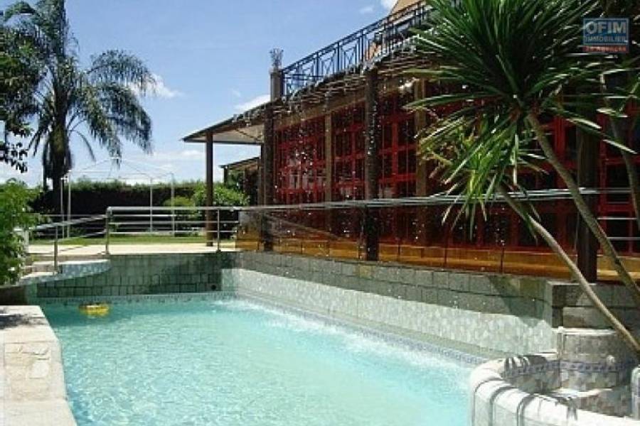 OFIM vous propose cette majestueuse propriété boisée de 1.810m2, composée d'une grande villa principale, piscine, restaurant-terrasses et de bungalows construits en 2007. Située à côté de la nouvelle grande rocade reliant la RN2 et la RN3, plus précisément le by-pass et le Marais Masay, avec une possibilité d'accès direct, cette grande propriété, anciennement chambres d’hôtes/restaurant bien connues sur le marché d’hôtellerie à l’étranger (Expedia, Booking.com, Abritel, etc.) et aussi sur le marché local, est située dans un quartier calme et offre un cadre alliant à la fois la sérénité et la quiétude. L’endroit est unique, calme et respectueux de la nature. Elle se compose ainsi de : • Une accueillante villa de 440m2 construite en 2007 avec ses terrasses, équipée avec des matériaux utilisés dans l’hôtellerie : groupe électrogène, bain de mousse et avec son propre système indépendant de groupe surpresseur et citerne, • Un double bungalow rustique de 60m2 comprenant deux chambres (dont une avec cuisine) avec 2 WC/douches et terrasses, • Deux appartements de 35m2 comprenant deux chambres (dont une avec cuisine) avec WC/douches et ses terrasses. Bungalow et appartements ont leur propre système indépendant de groupe surpresseur et citerne. Chaque chambre, soit à la villa, soit aux bungalows, dispose d’une terrasse et d’un WC/douche. Le reste de la propriété se compose de: • Trois restaurant-terrasses de 190m2 couvertes et ouverts au jardin en bois équipées : Four à pizza pour une cuisson au feu de bois, grill, des tables en, bois et en pierre pour une capacité d’une soixantaine de couverts, bancs, écran de projection, etc, • Un bar rustique avec : coin terrasse de 40m2 (sol en carreaux au style méditerranéen) et toit en inox et verre, • Un salon de massage à côté de la piscine : vestiaire, WC douche, • Une piscine de 4x12m : grand bassin avec son " rideau d’eau / cascade " de 10 m et un petit bassin circulaire (type jacuzzi) chauffée jusqu’à 36° en été par de grands panneaux solaires, • 3 jolies dépendances de 70m2 (dont une avec cuisine, terrasse et four) avec salles d’eau, four malgache et WC attenants chacune pour gardien/jardinier, • Cerise sur le gâteau, un joli bassin dans le jardin avec une petite fontaine en circuit fermé qui donne une touche de quiétude et de zénitude à l’ensemble. Cette propriété qui offre en tout une surface bâtie de 1.260 m2, avec 35 pièces et 7 chambres est proposée au prix de : 1.150.000.000 AR. Prix de vente 371 000€ Pour un rendez-vous, merci de me contacter au :034 02 218 69 Mme Francia Honoraires à la charge du vendeur 28A63319, Numéro de mandat: 222T3 Tél. commercial: 0340221869