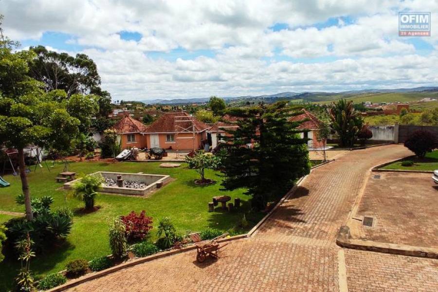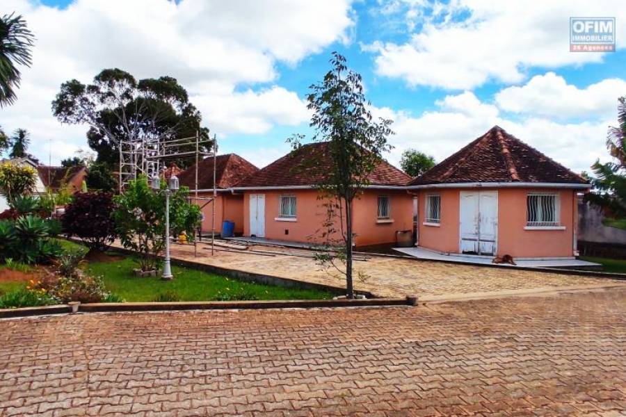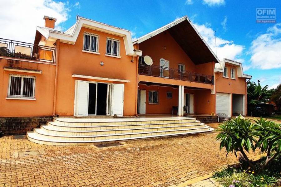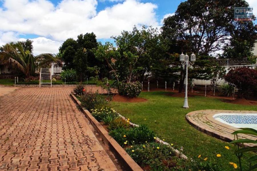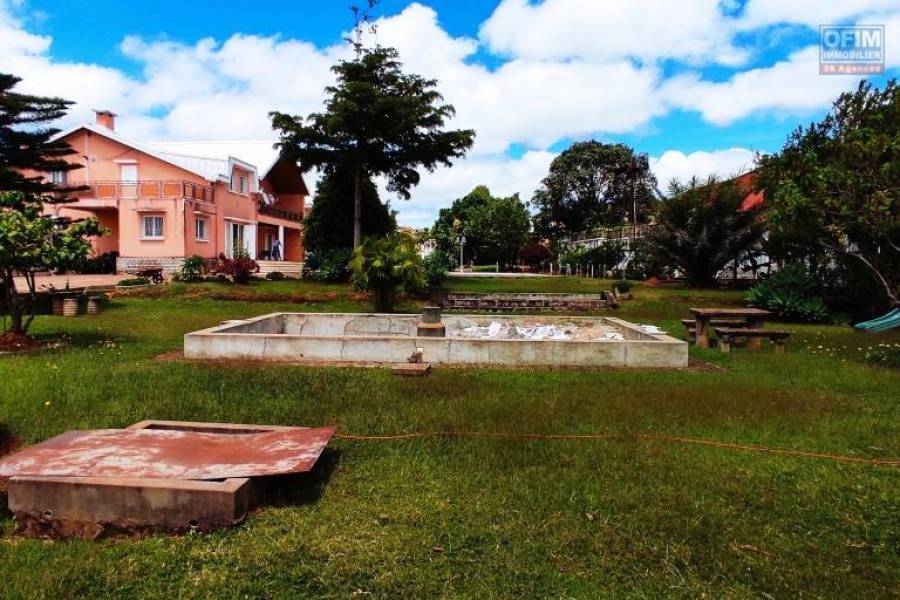 OFIM vous propose à la vente cette belle propriété de 3600m2, dans un bon quartier avec de bon voisinage, au calme et facile d'accès. située à 15mn du lycée Français d'Ambatobe et toutes ses commodités, entre autres : centre commercial, écoles, lycée ,pharmacies, boulangeries etc, et à 10mn de la RN2. Elle contient : une villa principale de type F10 à étage : Au RDC on trouve un grand séjour salle à manger avec cheminée et une grande terrasse, 4 chambres dont une suite parentale avec sa salle de bain privative, une pièce pour bureau, une salle de bain et un garage fermé attenant pour 2 voitures. l'étage se compose de 5 grandes pièces mansardées, avec des terrasse qui offre une belle vue, une salle de bain dont l'accès est complètement indépendant, il pourrait être aménagé en appartement indépendant. En annexe, 4 Bungalow avec coin nuit et salle d'eau chacune, une maison F3. L'extérieure est constitué d'une piscine, d'un bassin, d'un beau jardin avec des arbres fruitiers, jardin potager et une dépendance avec sanitaire La maison a une bonne structure et en bon état, un ravalement à prévoir elle possède un puit avec réservoir d'eau et surpreseur Contact pour visite Francia 0340221869 Honoraires à la charge du vendeur 28A66875, Numéro de mandat: 334T3 Tél. commercial: 0340221869