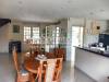 Une pièce à vivre lumineuse (séjour/salle à manger) ouvrant sur une large terrasse équipée de stores, avec une agréable vue sur la piscine et le jardin.
