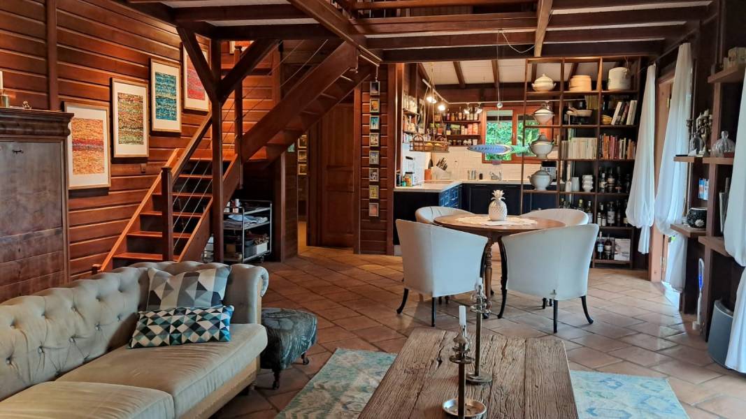 A l'étage, le logement principal d'une surface de 100 m2 vous séduira par ses volumes généreux et son ambiance chaleureuse : deux suites parentales pour accueillir famille ou invités avec confort, un séjour sublimé par une charpente apparente et une mezzanine en coursive avec coin bureau, une cuisine ouverte avec cellier attenant, idéale pour les moments de convivialité.