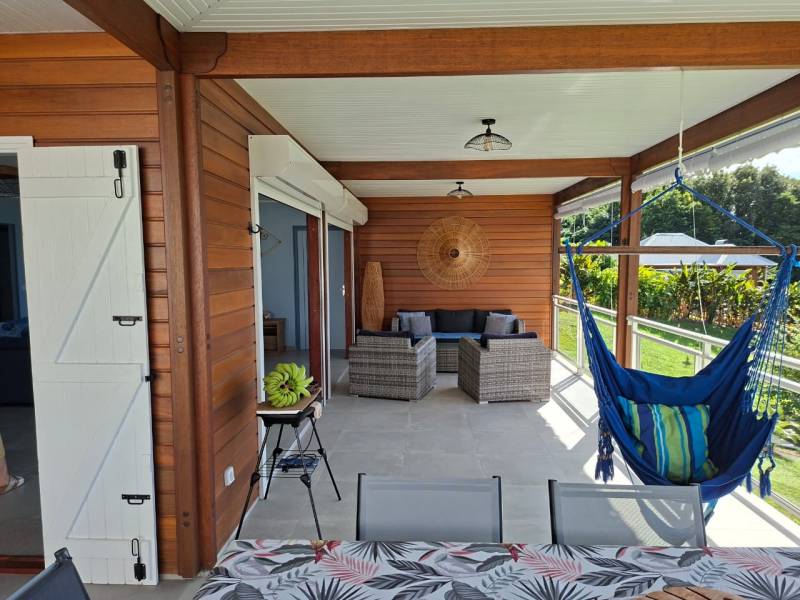 Une grande terrasse couverte de 42 m2, parfaite pour les repas et la détente, face à un panorama exceptionnel sur les Ilets Pigeon à Malendure.2 places stationnements privés.