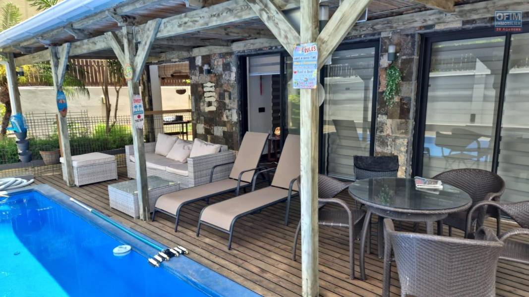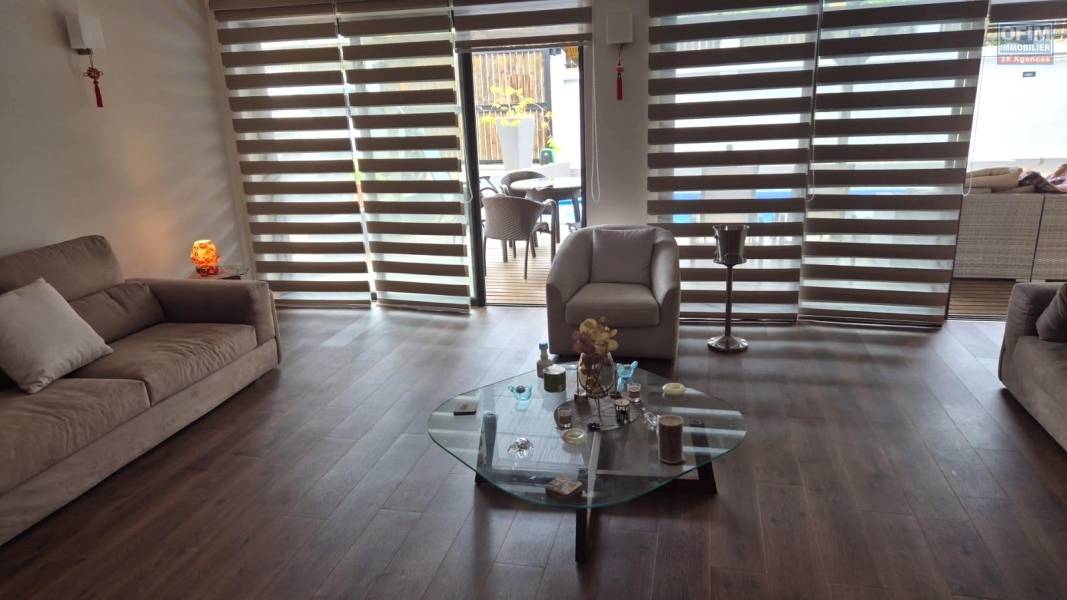 Située dans un quartier calme et recherché de Flic-en-Flac, cette superbe villa contemporaine offre de beaux volumes, des finitions haut de gamme et un cadre de vie idéal. Construite en 2015, elle développe environ 384 m² sur un terrain de 459 m², parfaite pour une famille ou un investissement. Elle se compose de 3 chambres en suite avec dressings, d’un vaste séjour lumineux en espace ouvert, d’une salle à manger, d’une cuisine entièrement équipée, d’un salon TV indépendant, d’une buanderie et de nombreux rangements. À l’extérieur, vous profiterez d’une piscine privée de 7 m x 4 m avec jacuzzi, d’une terrasse couverte, d’un jardin clôturé avec espace BBQ et cuisine extérieure, ainsi que de 2 parkings. Un rooftop aménageable avec vue mer vient compléter ce bien rare.