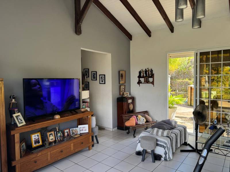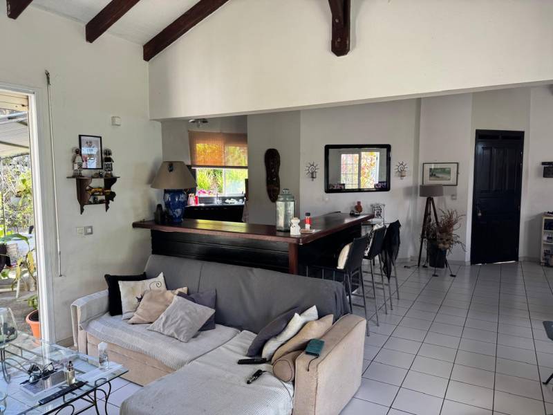 Le vaste séjour traversant, ouvert sur les terrasses, permet de profiter pleinement de la douceur du climat guadeloupéen et du panorama exceptionnel. Le jardin, arboré et sans vis-à-vis, offre un cadre paisible, parfait pour se détendre ou recevoir.