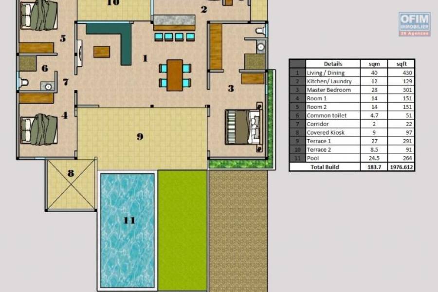 Découvrez un projet exclusif de villas individuelles de plain-pied nichées dans un complexe résidentiel très calme et parfaitement sécurisé, idéalement situé au Chemin 20 pieds, à quelques minutes seulement des superbes plages de Pereybere et de l'effervescence de Grand Baie. Ce concept de villa sur plan vous offre un potentiel exceptionnel et la possibilité d'acquérir votre future maison à un stade d'achèvement, vous permettant une certaine flexibilité. Deux options disponibles : villa à achever ou villa achevée. Chaque villa est conçue pour votre confort et votre bien-être : •Surface habitable optimisée sur un seul niveau pour une vie pratique. •3 chambres spacieuses et climatisées, garantissant des nuits paisibles. •Une magnifique suite parentale, véritable cocon privé, avec salle de bain attenante et accès direct à la terrasse et à l'espace piscine. •Un extérieur aménagé avec soin, incluant une piscine privée pour vous rafraîchir et un kiosque couvert pour vos moments de détente ou vos repas en plein air. •Un patio discret à l'arrière de la maison, offrant un espace intime supplémentaire. Profitez d'un environnement résidentiel de qualité, où calme, sécurité et proximité des commodités s'allient parfaitement. Option Villa à Achever : Saisissez l'opportunité d'acquérir cette villa à un stade d'achèvement, vous offrant potentiellement une optimisation des coûts ou la possibilité d'apporter votre touche personnelle aux finitions intérieures. Prix : À partir de 7,700,000 RS + frais ( prix pour la version achevée disponible sur demande et dépend des spécifications finales.) Ne manquez pas cette chance unique de créer la villa de vos rêves dans un cadre idyllique ! Plus que 2 lots disponibles !!! Contactez-nous dès aujourd'hui pour découvrir ce projet et les modalités d'acquisition en cours d'achèvement. Cette villa représente l'alliance parfaite entre confort moderne, localisation idéale et cadre de vie exceptionnel. Réservé au marché mauricien. Mandat: 2676GB N'hésitez pas à nous contacter pour plus d'infos ou une éventuelle visite, Isabelle au (+230) 5823 8220, disponible sur WhatsApp Adresse mail: [coordonnées réservées] Honoraires à la charge du vendeur 16A70729, Numéro de mandat: 2676GB Tél. commercial: +230 5823 8220