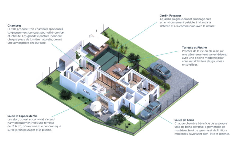 - un séjour ouvert et convivial avec une cuisine aménagée donne sur une terrasse de 51 m2, offrant une vue panoramique sur un jardin paysagé et une piscine au sel, invitant à la détente.