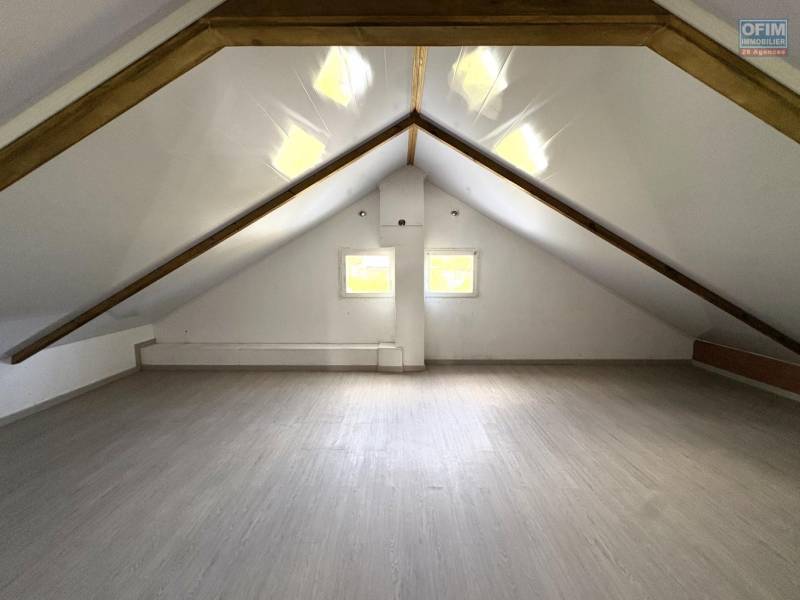 A l'étage se situent les combles qui ont été aménagés en deux grandes chambres de 40 m2 au sol chacune ainsi qu'un espace sanitaire avec douche et WC. Au vu de la superficie des chambres de l'étage, vous aurez la possibilité de créer 2 chambres supplémentaires. Un garage de 25 m2 environ vous permettra d'y stationner un véhicule et d'y faire du rangement.