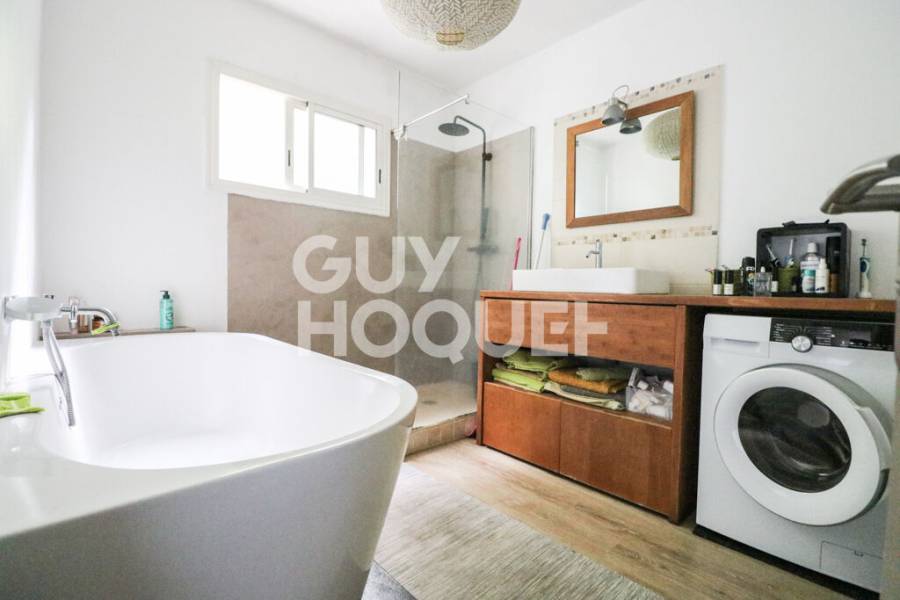 GUY HOQUET - BOIS DE NÈFLES - SAINT-DENIS En fond d'impasse, dans un environnement calme et verdoyant, venez découvrir cette belle villa T6/7 d'environ 242 m² habitables (320,76 m² utiles), implantée sur une parcelle clôturée de 733 m². Idéalement située à proximité immédiate du collège de Bois de Nèfles, du lycée Mémona Hintermann-Afféjee et de la gare du téléphérique, elle offre un cadre de vie pratique et recherché. Elle se compose, au sous-sol, d'un vaste garage carrelé et lumineux de 66 m² ainsi que d'une chambre attenante de 16 m². Au rez-de-chaussée, vous apprécierez un séjour spacieux de 37 m², une cuisine aménagée et équipée, une salle de bains avec baignoire et douche, trois chambres confortables, un WC et une agréable varangue d'environ 20 m². A l'étage, un second espace de vie d'environ 15 m², deux chambres, une salle de bains, un WC et une grande varangue de 24 m² offrant une belle vue mer. A l'extérieur, laissez-vous séduire par un espace détente avec piscine au sel, idéal pour profiter pleinement du cadre paisible. Altitude : 270m