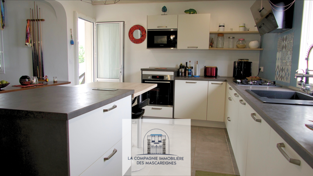 La maison principale se compose de 4 chambres climatisées, d’une salle d’eau moderne avec double vasques et douche italienne, ainsi que d’une cuisine américaine aménagée et équipée ouverte sur un séjour lumineux, créant un espace de vie convivial et chaleureux.