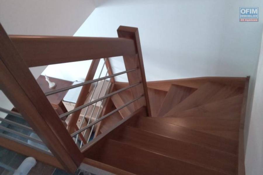 L’agence OFIM vous présente dans un quartier résidentiel recherché de Saint-Leu, cette maison F4 jumelée contemporaine de 2016 vous séduira par son design moderne, la qualité de sa construction et son environnement privilégié. L’environnement est calme et résidentiel, tout en étant situé à seulement 5 minutes du centre-ville et des axes routiers, offrant un parfait équilibre entre tranquillité et praticité. Implantée sur une parcelle d’environ 210 m² piscinable, elle développe environ 90 m² habitables et bénéficie d’une varangue couverte de 20 m², véritable prolongement du séjour. Construite en dur et habillée de bardage, elle présente un toit monopente au design contemporain, garantissant élégance et durabilité. Prestations haut de gamme L’espace de vie totalise environ 38,9 m² (séjour 28,7 m² + cuisine américaine 10,2 m²), ventilé et traversant, offrant une belle luminosité naturelle. La cuisine contemporaine entièrement aménagée est équipée de : Plaque cuisson à gaz. • Hotte aspirante • Four • Lave-vaisselle avec mobilier haut et bas. Un escalier en bois massif exotique mène à l’étage et intègre un cellier aménagé de 4 m². Un WC suspendu avec lave-mains est situé au rez-de-chaussée. À l’étage : • 3 chambres climatisées avec placards • Salle de bain moderne avec douche à l’italienne, faïence murale, meuble vasque et WC suspendu Les finitions sont soignées : • Carrelage en grès cérame 60×60 au rez-de-chaussée • Parquet dans les chambres Extérieurs • Varangue couverte de 20 m² • Jardin privatif sur terrain piscinable • Deux places de stationnement privatives Équipements & confort • Volets roulants électriques au RDC • Menuiseries aluminium • Portail motorisé avec visiophone • Chauffe-eau solaire • Climatisation dans les chambres • Raccordement au tout-à -l’égout Informations • Construction 2016 • Encore sous garantie décennale • Taxe foncière : 1 646 € • Aucune charge de copropriété Une maison moderne, qualitative et parfaitement située, idéale pour une résidence principale, secondaire ou un investissement à Saint-Leu. Pour plus de renseignements ou une éventuelle visite, Merci de contacter uniquement par Honoraires à la charge du vendeur 14A72229, Numéro de mandat: 778 LP Tél. commercial: [coordonnées réservées]