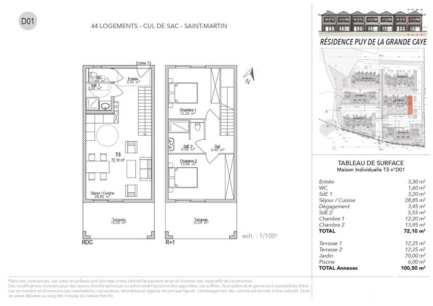 A vendre maison de 2 chambres en duplex avec piscine en VEFA de grand standing d'une superficie de 72,5m2 offrant une vue mer sur l'Ilet Pinel et Saint-Barth, double terrasse (2x12,25m2), jardin (70m2) et 2 places privatives dans une résidence privée et sécurisée à Cul de Sac à Saint-Martin. Toutes les pièces sont équipées de climatiseurs et de brasseurs d'air y compris le séjour, la cuisine ouverte sur le séjour est meublée et équipée d'un four, d'une plaque et d'un évier. La salle d'eau offre une grande douche à l'italienne . Avec des finitions de qualités, le sol sera proposé en carrelage 90x22 imitation parquet dans tout le logement. En résidence principale ou secondaire, mais aussi pour des investissements locatifs, cette nouvelle adresse réunit tous les atouts pour en faire un lieu de vie incomparable entre la mer et le sable blanc. La résidence Les Jardins de la Grande Caye, située dans le quartier en expansion de Cul-de-Sac à Saint-Martin, présente une architecture élégante mêlant tradition caribéenne et modernité avec des pierres . Elle se compose de 44 logements répartis entre 20 appartements de 2 à 3 pièces et 24 villas mitoyennes de 3 à 4 pièces, conçus pour un confort optimal et une immersion dans un cadre naturel exceptionnel. Les bâtiments, disposés en plateforme le long de la colline, s'intègrent harmonieusement au paysage grâce à leur utilisation de pierres claires et d'ardoises. Cette appartement bénéficie de jardin privé et de terrasses, offrant des espaces de vie intérieurs et extérieurs confortables et bien pensés. Les Jardins de la Grande Caye bénéficient d'un emplacement privilégié entre Mont Vernon et l'Anse Marcel, offrant un accès facile à la plage de Baie Orientale et à l'animation de Marigot. A proximité de la zone commerciale de Hope Estate et de l'aéroport de Grand-Case, cette résidence est idéale pour ceux qui cherchent à combiner un cadre de vie tranquille avec la commodité d'accéder aux installations sportives, aux plages, et aux commodités urbaines. Les travaux de terrassement ont déja commencé, la livraison du programme est prévue au 4ième trimestre 2026 Réservez dès aujourd'hui votre maison neuve de 3 pièces à Saint-Martin et contactez votre agence Nestenn au [coordonnées réservées] ou le [coordonnées réservées] pour plus de renseignements. Les informations sur les risques auxquels ce bien est exposé sont disponibles sur le site Géorisques : www. georisques.gouv. fr