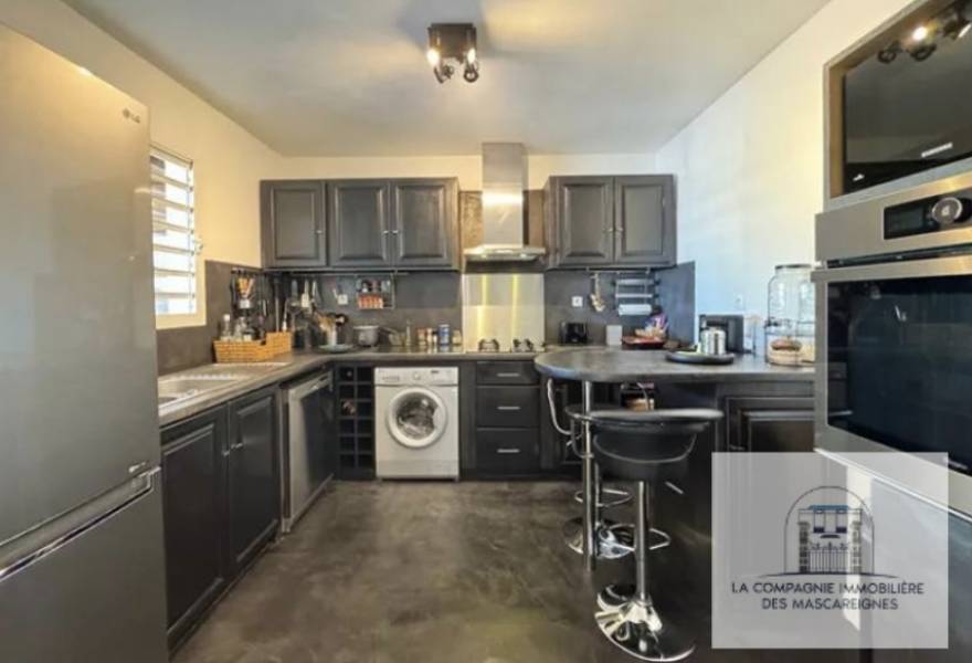 Pour vos repas et réceptions, une cuisine indépendante, aménagée et équipée vous offrant une vue sur la piscine.