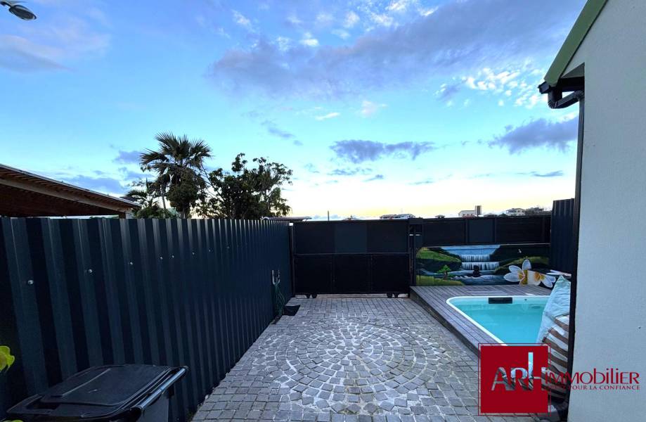 À l'avant, la maison dispose d'une piscine au brome de marque Doleau (3 x 3 m) ainsi que d'un espace de stationnement pour un véhicule. Un second stationnement extérieur est également rattaché au bien.