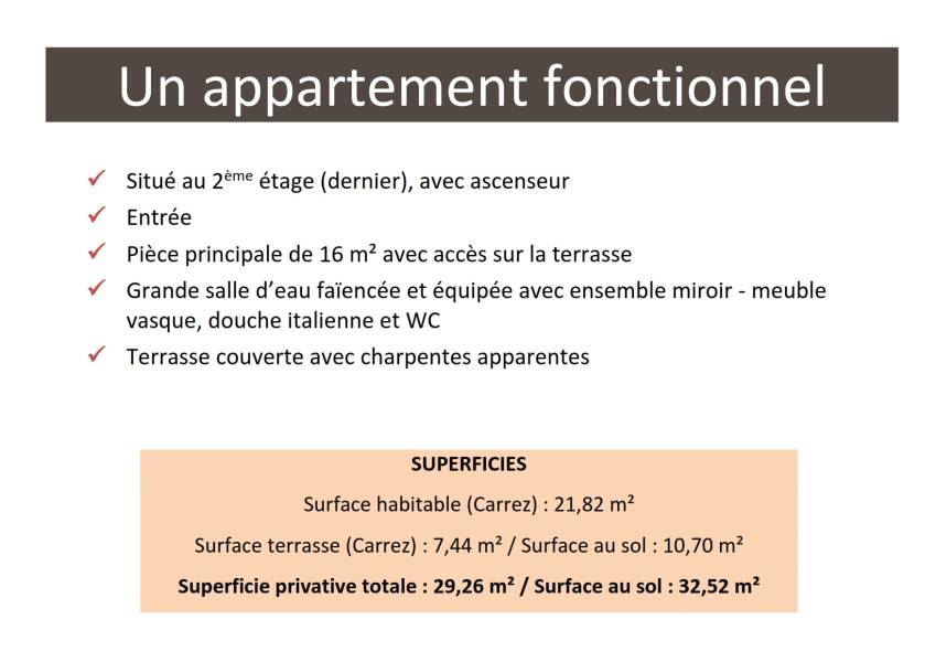 Cet appartement de 21,82 m2 habitable (carrez) auxquels s'ajoute la terrasse couverte de 7,44 m2 (10 m2 surface au sol) vous séduira par son élégance et ses finitions.