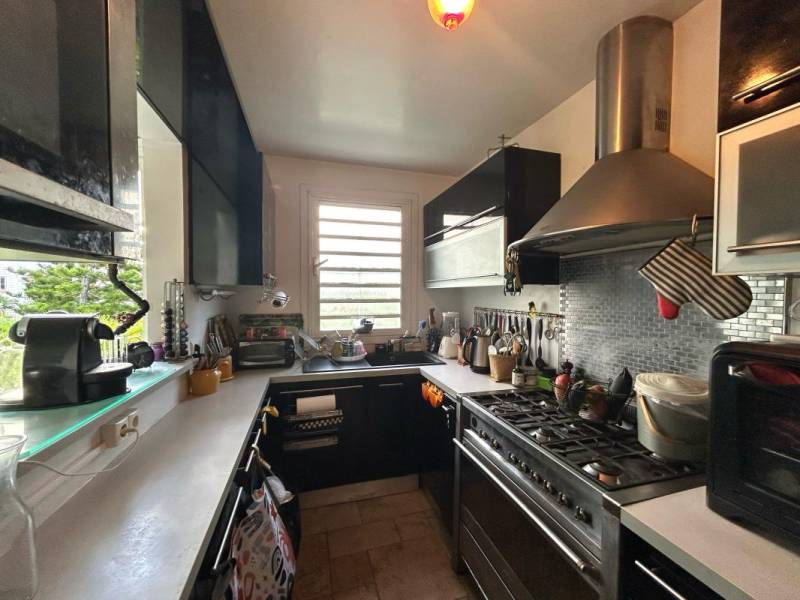 Vous profiterez de 2 chambres, 1 bureau, 2 salles de bains avec wc, d'une grande pièce à vivre, une cuisine équipée et deux grandes terrasses aménagées avec vue sur les jardins.