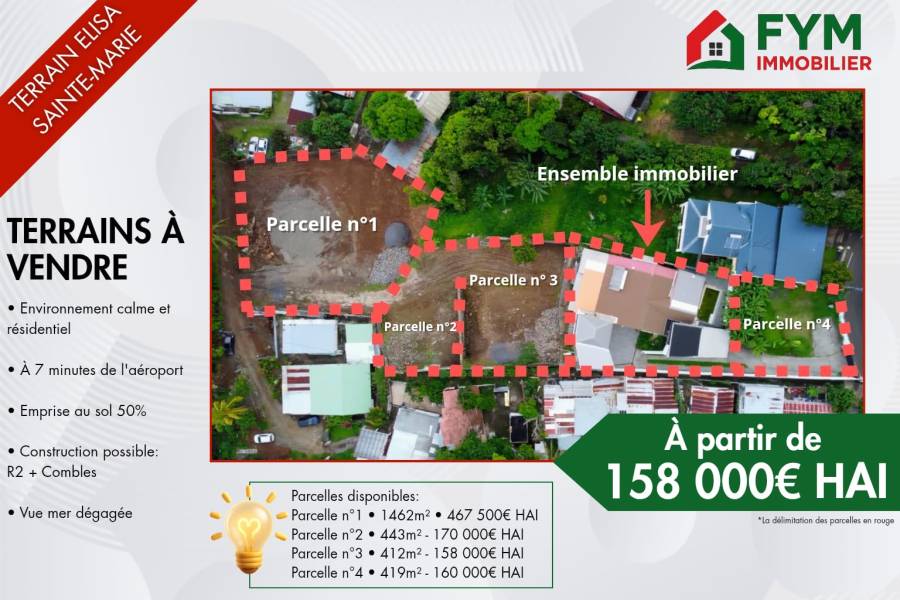 FYM IMMOBILIER vous propose à la vente plusieurs parcelles idéalement situées dans le secteur recherché de Terrain Elisa à Sainte-Marie, réputé pour son environnement calme, résidentiel et préservé.