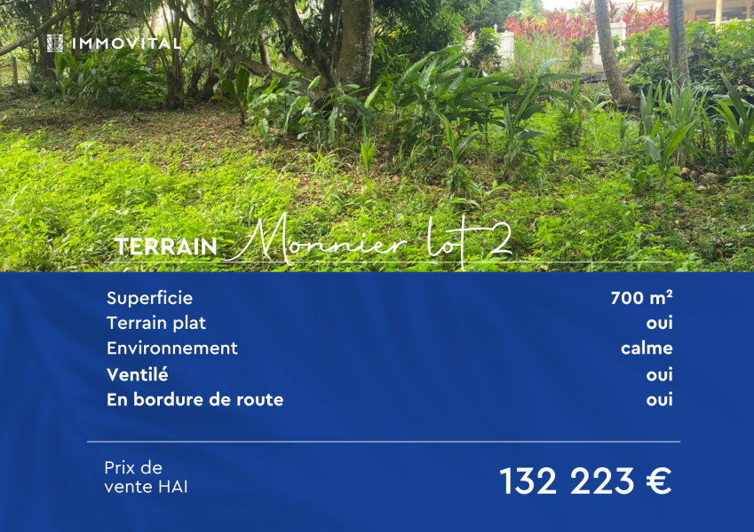 IMMOVITAL vous propose à la vente ce superbe terrain plat de 700 m2, situé dans le quartier recherché de Monnier, sur la commune du Lamentin, en Guadeloupe.