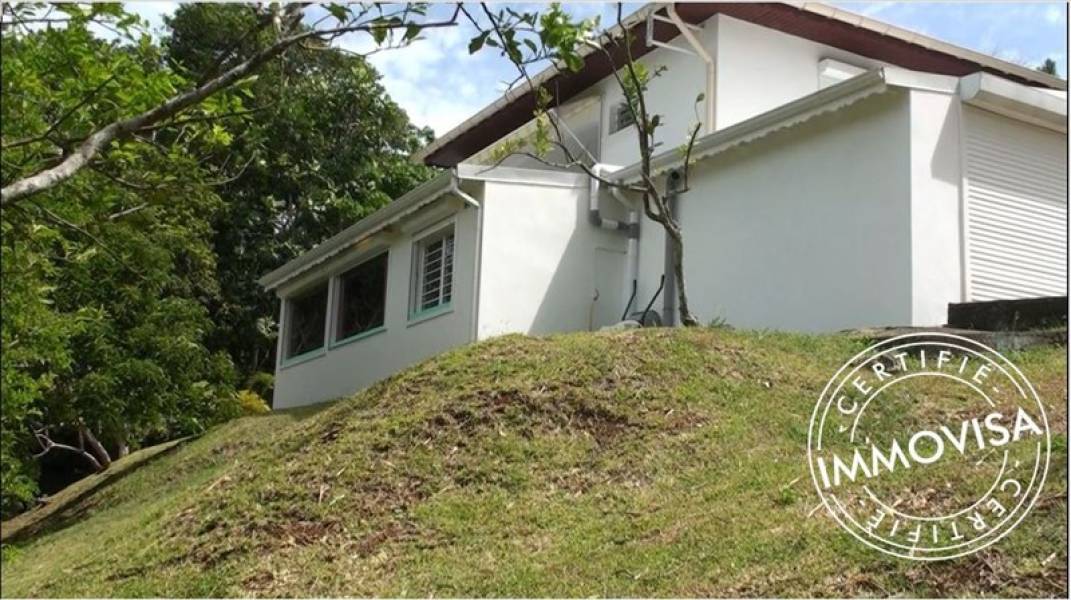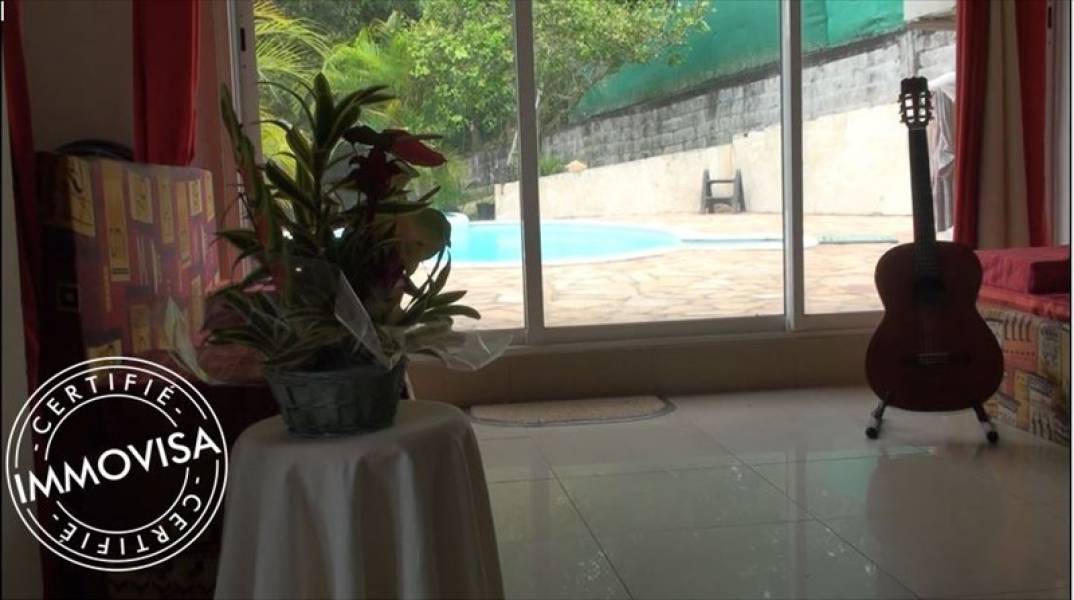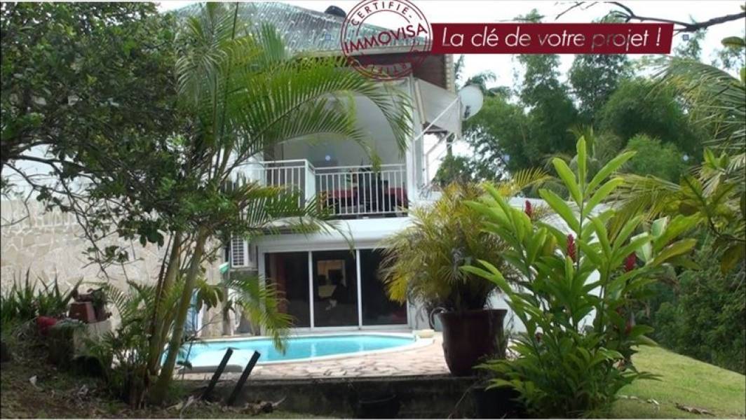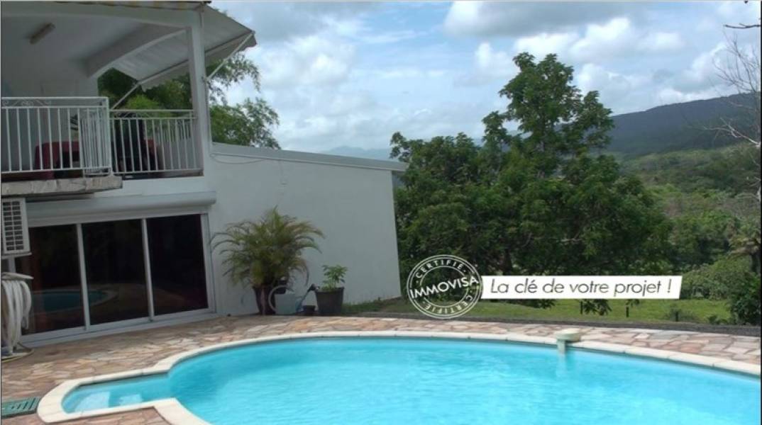 Cette villa construite en 2005 sur un terrain de 804 m2 planté de nombreux arbres fruitiers (acérola, mangue, banane, sapotille, avocat,..), comporte 2 niveaux pour 113 m2 habitables, disposant chacun d'un accès indépendant. L'orientation des espaces de vie, tout comme la plage de la piscine, procure une vue exceptionnelle à 180° sur la campagne, révélant montagnes et vallées. Le rez de chaussée dispose d'une pièce à vivre avec cuisine américaine aménagée, prolongée par une terrasse, une chambre et une salle d'eau. En rez de jardin, accessible sans escalier, un espace modulable de plus de 48 m2 (utilisé pour l'exercice de la profession de la propriétaire), disposant d'une cuisine aménagée, peut être transformé en appartement indépendant. Un garage de 15 m2, fermé par un rideau électrique, complète ce niveau. Amateur de la nature, du calme, des espaces ventilés, cette villa sans vis à vis vous séduira, idéale pour un 1er achat ou pour un couple occupant l'un des deux niveaux et louant l'autre. FAI ttc