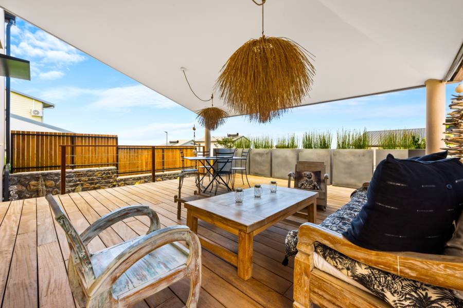 - Varangue en bois exotique avec vue océan, prolongeant harmonieusement la maison principale