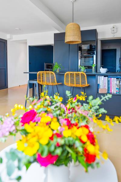 - Cuisine moderne entièrement équipée, ouverte sur un spacieux séjour lumineux avec vue mer