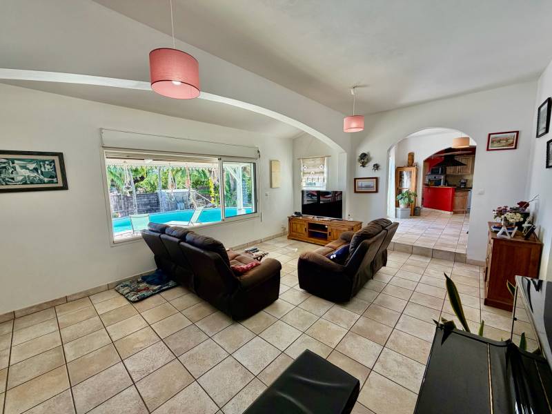 SAINT JOSEPH 97480 - À découvrir rapidement, cette magnifique villa familiale de type 5, offrant une surface habitable de 180 m2, le tout implanté sur une vaste parcelle plane de 1300 m2 environ. Idéalement située dans un quartier agréable, cette villa offre de beaux volumes. Le coin jour bénéficie d'un séjour lumineux de 27 m2, d'une salle à manger et d'une cuisine aménagée et équipée de 18 m2, le tout ouvert sur la vaste et belle varangue de 40 m2. Idéal pour passer de supers moments entre amis ou en famille. Profitez de 4 chambres confortables dont 2 composées de leur propre salle de bains, de 2 salles de bains et d'un WC indépendant. Pour plus de fonctionnalité, la maison propose également un cellier et un bureau. À l'extérieur, la belle piscine au sol, ne manquera pas de vous plaire. Facilement accessible et proche des commodités.