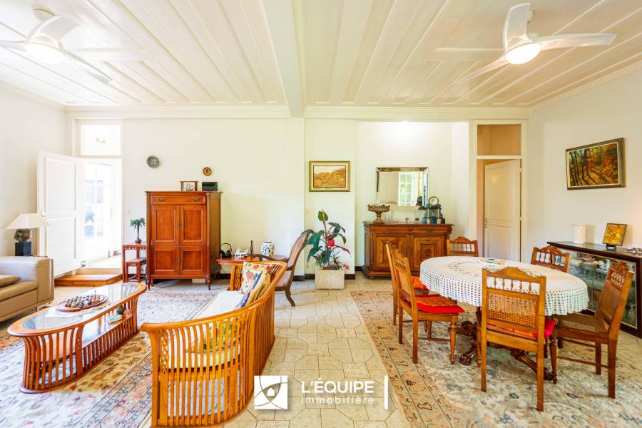 L’intérieur s’articule autour d’un vaste séjour-salon, aéré et lumineux de 38 m2 (belle hauteur sous plafond), d’une cuisine séparée avec cave, d'une salle d'eau et d'un wc séparé. L'étage se compose de quatre chambres, d'une salle de bain, d'un wc séparé et deux grands balcons .