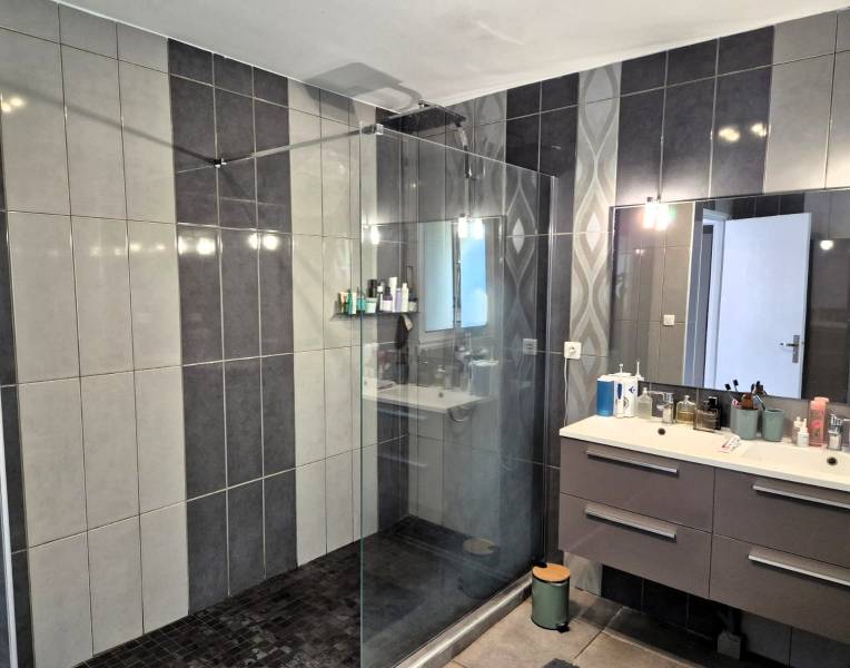 Salle d’eau moderne : douche à l’italienne, double vasques