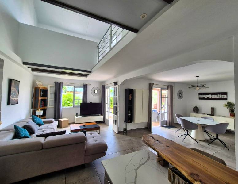 Pièce de vie lumineuse avec très grande hauteur sous plafond et belle cuisine ouverte équipée et meublée