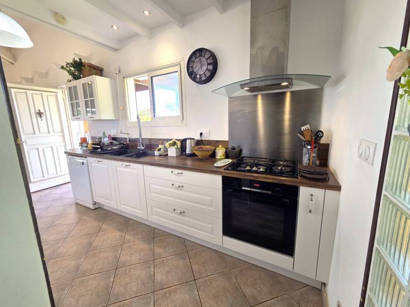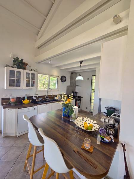 La maison présente une belle cuisine entièrement réaménagée, ouvrant sur l'espace séjour-varangue qui ne fait plus qu'un, totalisant près de 70m2 de surfaces pour l'espace jour.
