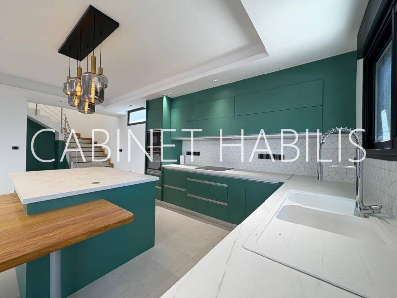 Le rez-de-chaussée accueille une cuisine ouverte sur un vaste séjour, à la fois chaleureux et raffiné, offrant un espace de vie idéal pour recevoir. Cet ensemble s’ouvre harmonieusement sur une agréable terrasse. Un coin bureau vient compléter ce niveau.