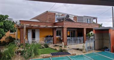 maison F5 d'environ 180m2 avec piscine sur un terrain de 782M2 compose de 4 chambres: au rdc: 3 chambres, un sjour de 55M2, une cuisine ouverte de 12,5M2, une salle d'eau, une varangue de 41,5M2, un cellier de 18M2, un garage de 31,5M2, terrasse arrire de 17,5M2, et cuisine au feu de bois et un jard...