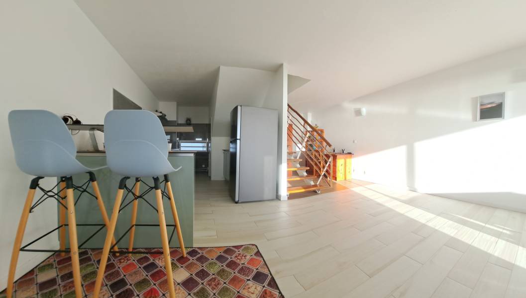 Niveau principal : un salon-séjour spacieux lumineux, idéal pour créer un espace de vie convivial, un dégagement aménagé en coin bureau, une cuisine ouverte sur le séjour, un balcon avec vue mer.