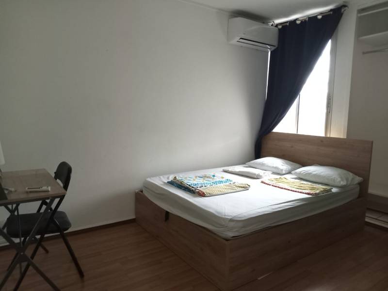 Une entrée, un séjour, une cuisine aménagée et équipée, une chambre climatisée avec une salle d’eau et un WC.