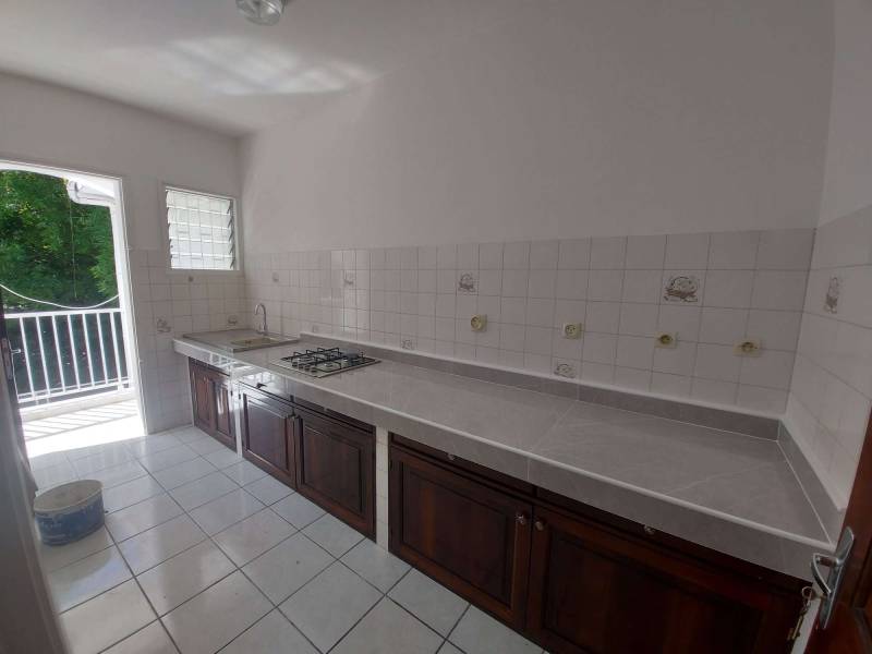 Pièce de vie lumineuse avec cuisine séparée et aménagée (plaque et placards), deux chambres avec balcon, salle de bain avec douche à l'italienne et WC séparé.