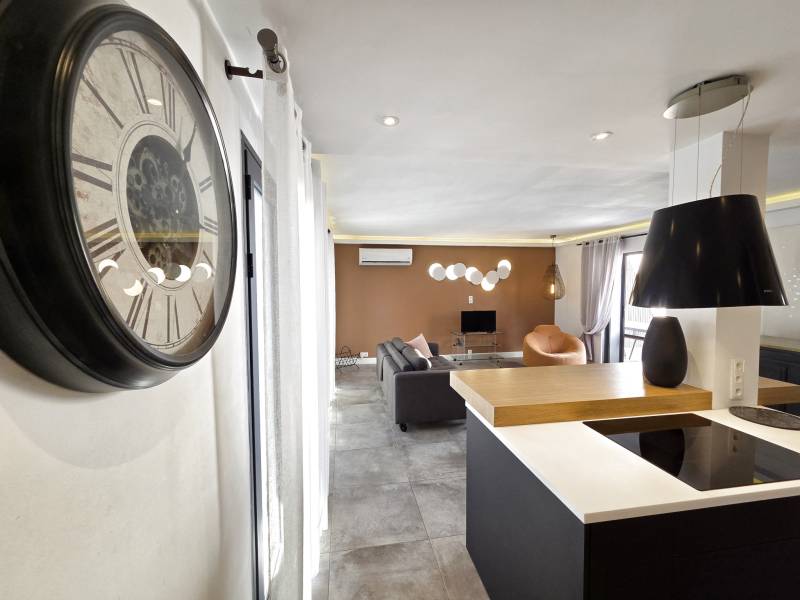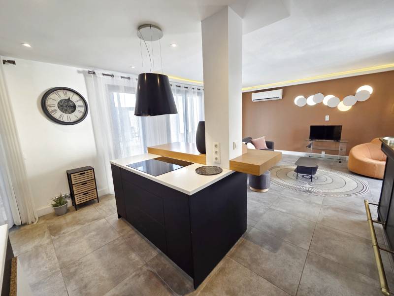 - au RDC par une porte sécurisée, rangement sous l'escalier et accès au 1er niveau sur un vaste séjour-cuisine proposant plus de 40m2 très bien aménagé, traversant, avec nombreuses ouvertures sur balcon d'un côté et terrasse de près de 25m2 de l'autre. La cuisine, très bien aménagée et meublée, avec plan et ilot central, frigo américain et électroménager, permet une utilisation optimale. 2 céliers dont 1 avec lave-linge et sèche linge et l'autre permettant de stocker et ranger, et un cabinet de toilettes.