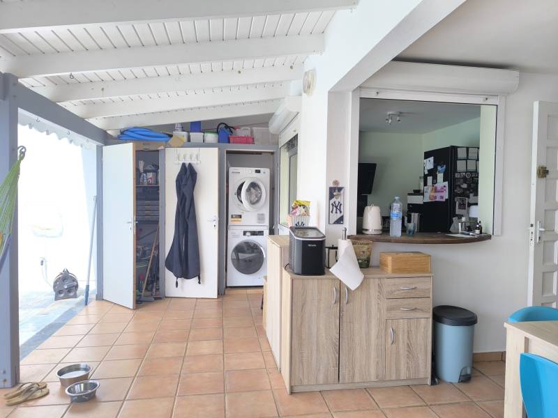 WC invité, grande terrasse couverte de 50 m2 avec un espace buanderie discret ( lave-linge, sèche-linge, lave-vaisselle et rangement )