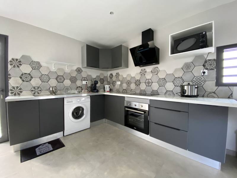 Une cuisine ouverte moderne et aménagée, équipée de plaques, four, hotte, micro-ondes, réfrigérateur et lave-linge