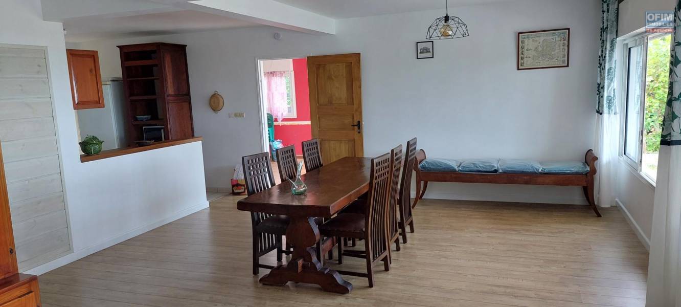 Meublé : A louer aux Avirons centre villa meublée de type F3 avec jardin arboré. La maison d'une surface habitable de 110 m2, comprend deux chambres, un dégagement, une cuisine équipée, un séjour, une salle à manger, deux salles d'eau/ WC, un chauffe eau solaire, un garage spacieux, un portail électrique, un grand dressing. Accès très aisé à la voie rapide. Commerces et services à proximité.