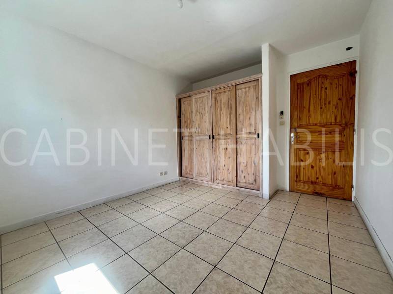 Au rez-de-chaussée vous y trouverez une cuisine équipée (plaque à gaz, hotte, four) ouverte sur un séjour, une salle d'eau avec WC, une chambre climatisée avec dressing.