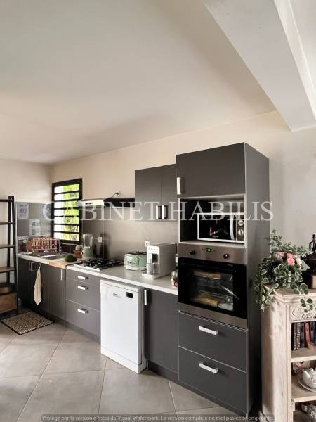 Elle se compose d'une cuisine ouverte sur un séjour, d'une salle d'eau, d'un WC, d'une varangue et d'un garage.