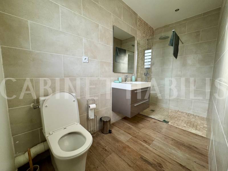 Elle se compose d'un séjour avec cuisine ouverte et équipée, un cellier, de trois chambres avec placards et climatiseurs, une suite parentale avec salle d'eau + WC, une salle de bains avec douche et baignoire et un WC séparé. Profitez également d'une agréable terrasse donnant sur une piscine privée, parfaite pour se détendre en famille ou entre amis.