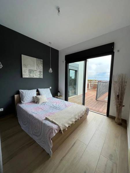 À l'étage : Une suite parentale avec salle d'eau privée et accès direct à une terrasse offrant une superbe vue mer.